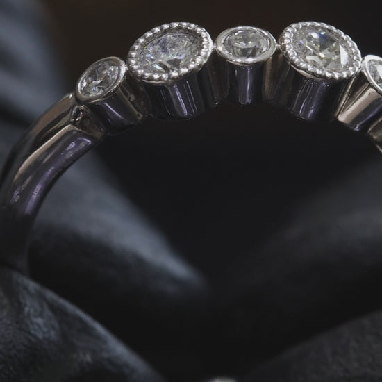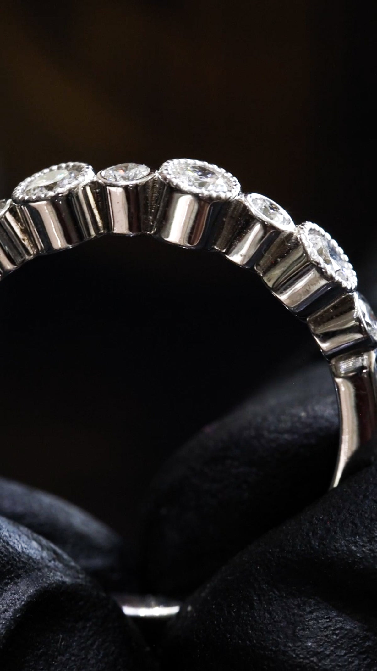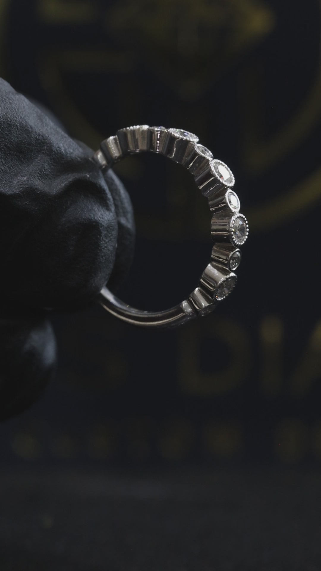 This refined diamond band features a series of round brilliant diamonds, each securely bezel-set across the top portion of the ring. The smooth bezel settings create a clean, contemporary look while offering enhanced protection and everyday wearability.