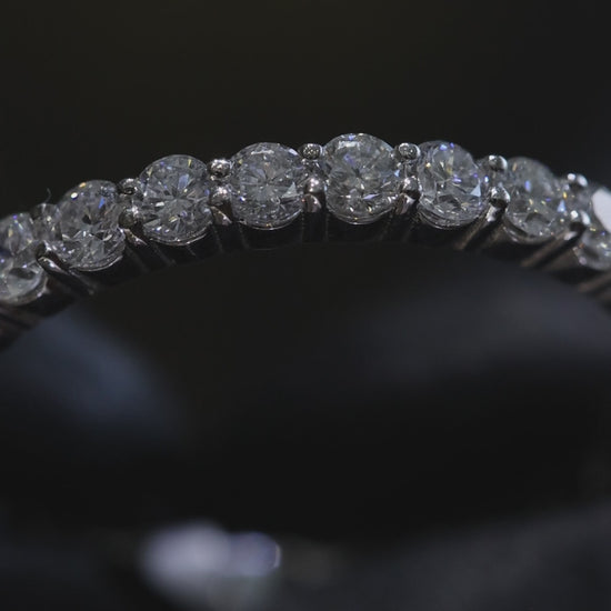 This round brilliant shared-prong diamond eternity band features perfectly matched diamonds set continuously in polished 14K white gold, creating a timeless design with uninterrupted brilliance from every angle.